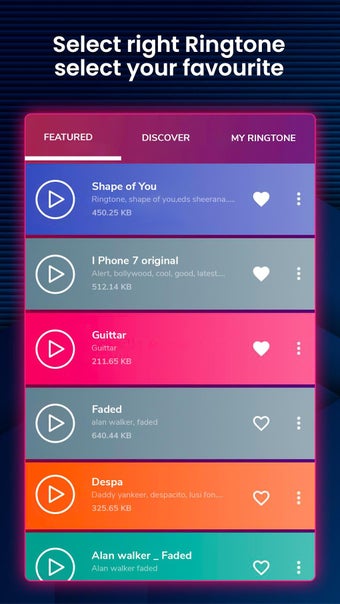 人気の着信音は、市場で最も人気のある着信音の最高で最も使いやすいコレクションです。デバイスに最高の体験を提供します。アプリ内のすべてのトーンは非常に高品質であり、クリーンでクリアなサウンドが期待でき、オフラインでもオンラインでも動作します。お気に入りのリングを検索するためにアプリを使用することもできます。または、異なるカテゴリをブラウズして見つけることもできます。好きな種類の着信音を選択し、再生ボタンをクリックして新しいエンターテインメント体験をお楽しみください。
